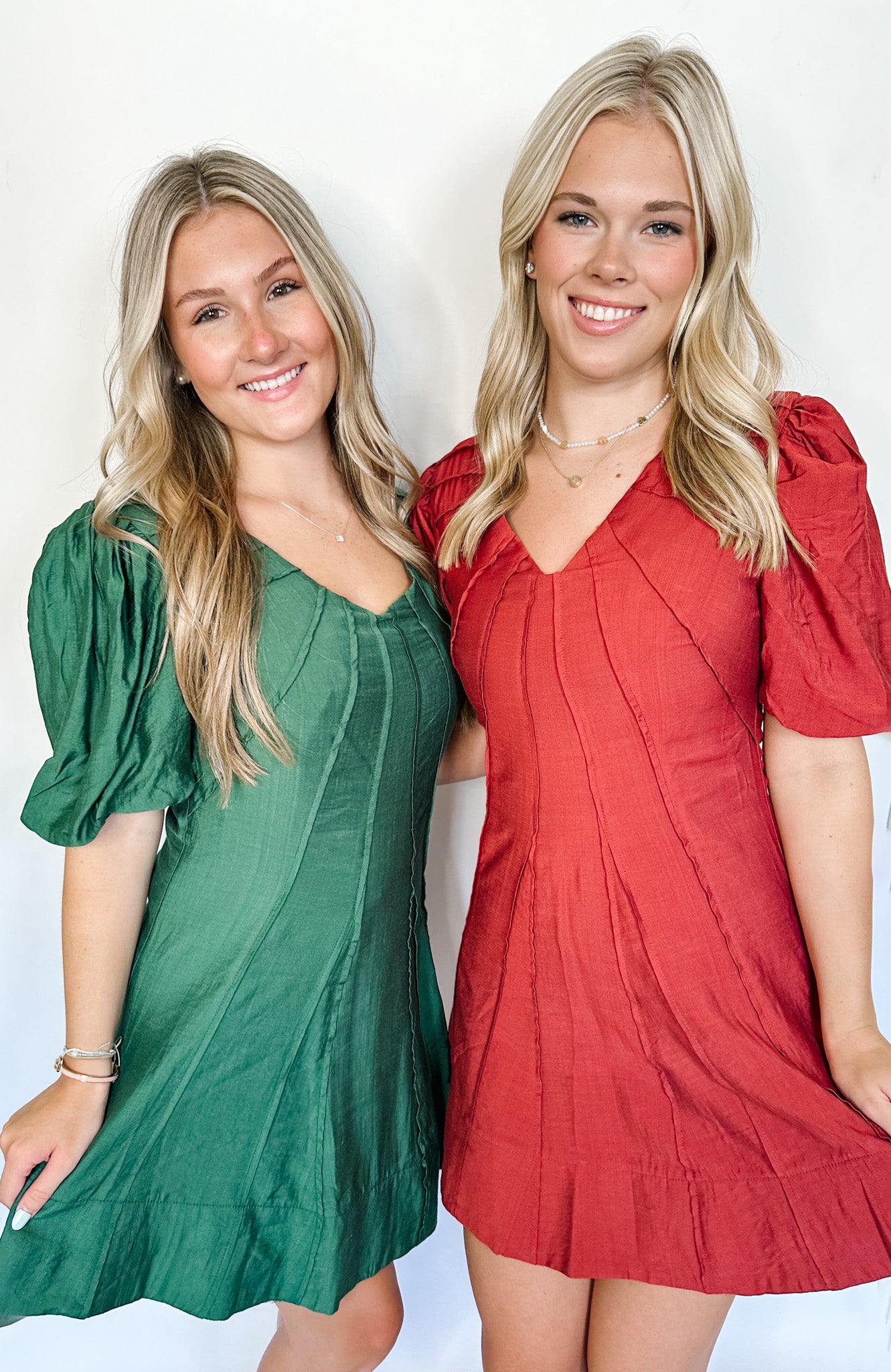 Introducing the TCEC Haven Dress. This elegant dress features a flattering v-neck design and vertical paneling for a slimming silhouette. The puff sleeve adds a touch of sophistication. Elevate your style with this exclusive piece from our luxury brand.
