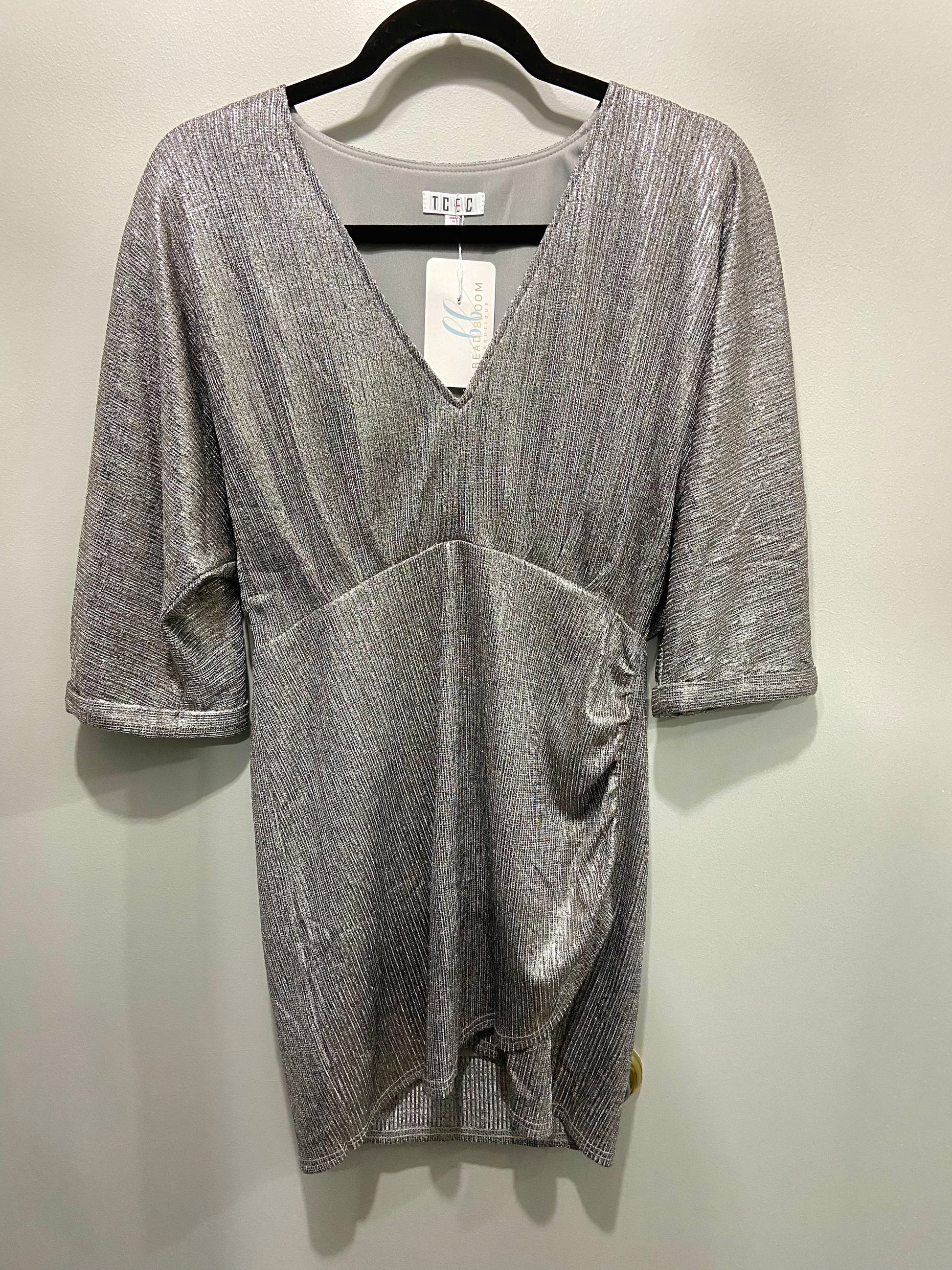 Enchant in this luxuriously shimmering TCEC Silver holiday dress. With a deep V-neck and classic ruching at the sides, this couture-inspired creation is sure to make a turn heads and capture the party's spotlight. Sparkle and shine like a star with this exclusive and elegant dress. Fully Lined