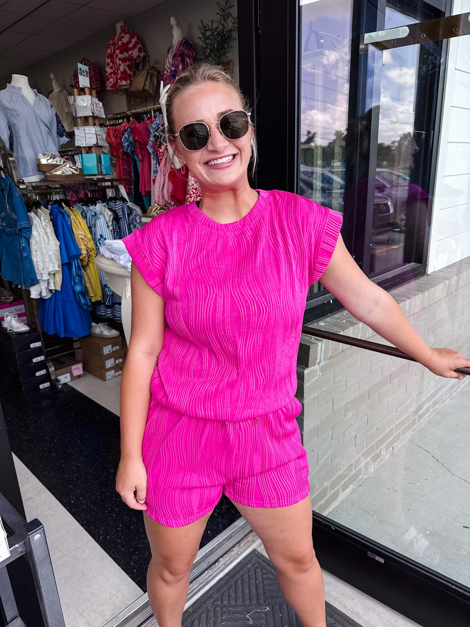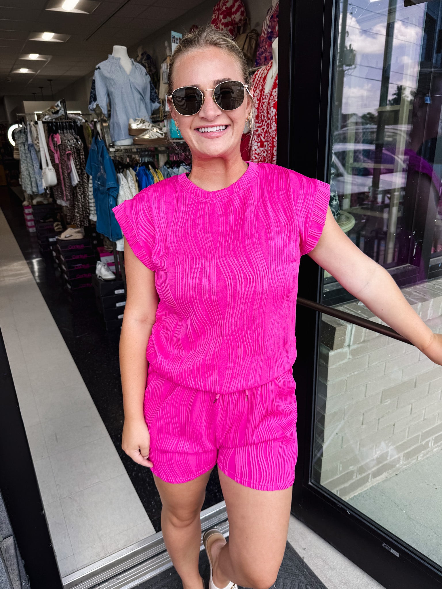 Experience comfort and style with our TD Sweet Love Set. This playful round neck cap sleeve top paired with matching shorts creates an adorable ensemble perfect for lounging or casual outings. The textured fabric adds a touch of dimension while keeping you feeling fresh and fashionable all day long.