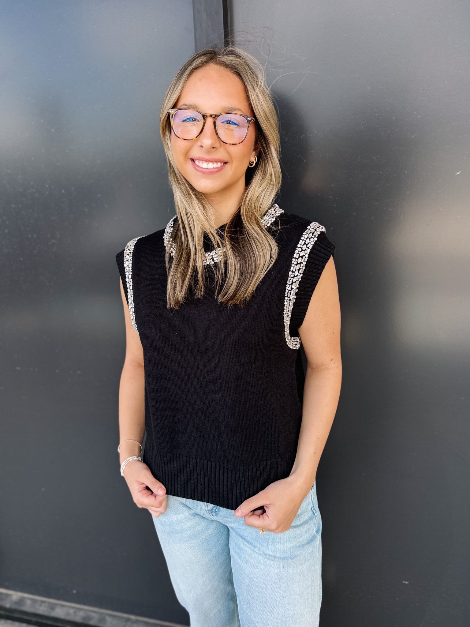 Shine with subtle elegance in The Blair Embellished Mock Neck Knit Top — a timeless piece that blends classic structure with modern sparkle. Crafted from a soft, mid-weight knit, this sleeveless beauty features a mock neckline and delicate embellishments tracing the neck and arm openings for a touch of refined glamour.