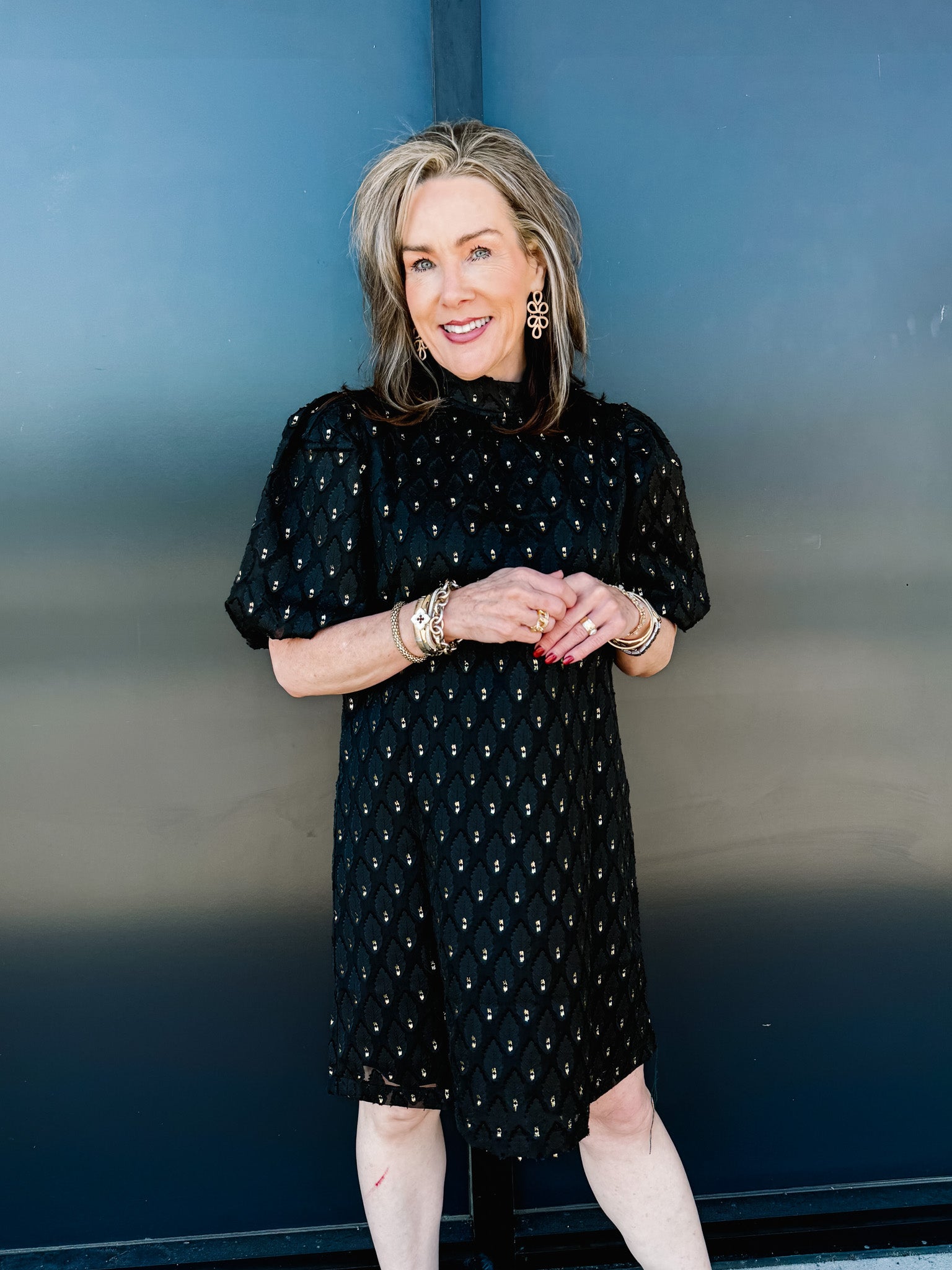 Indulge in sophistication with The Gloria Dress. Adorned with a luxurious gold textured bubble sleeve design and delicate ruffle collar neckline, this dress exudes opulence. Complete the look with an open back ribbon tie closure, elevating your style to exclusive levels. Embrace elegance and make a statement in The Gloria Dress.