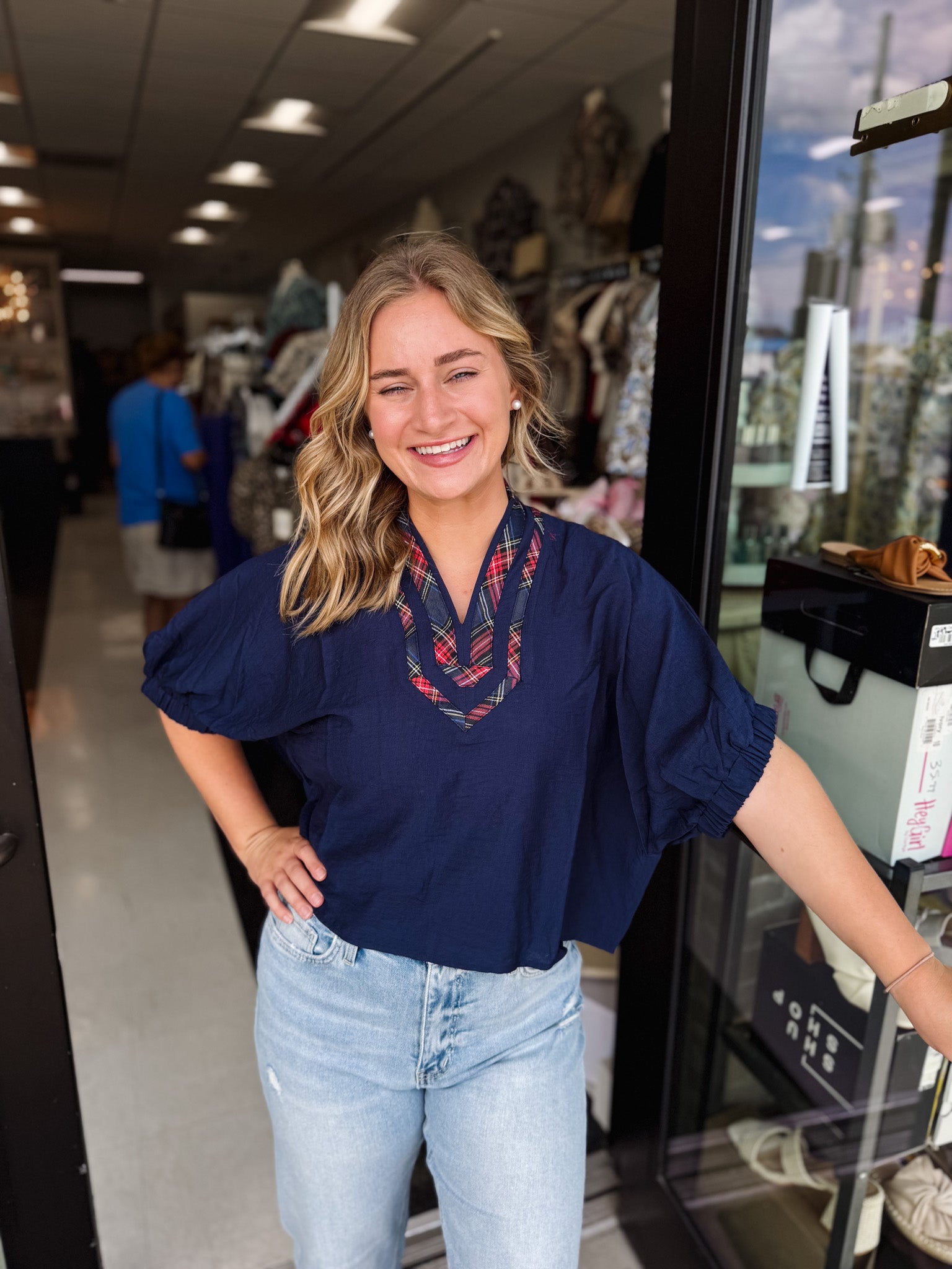 Elevate your wardrobe with the Holiday Season Top, a solid short sleeve dolman style enhanced by a distinctive plaid contrast high V-neck band. Crafted from lightweight, woven fabric, this top offers a refined yet comfortable fit without lining or sheerness, perfect for effortless sophistication.
