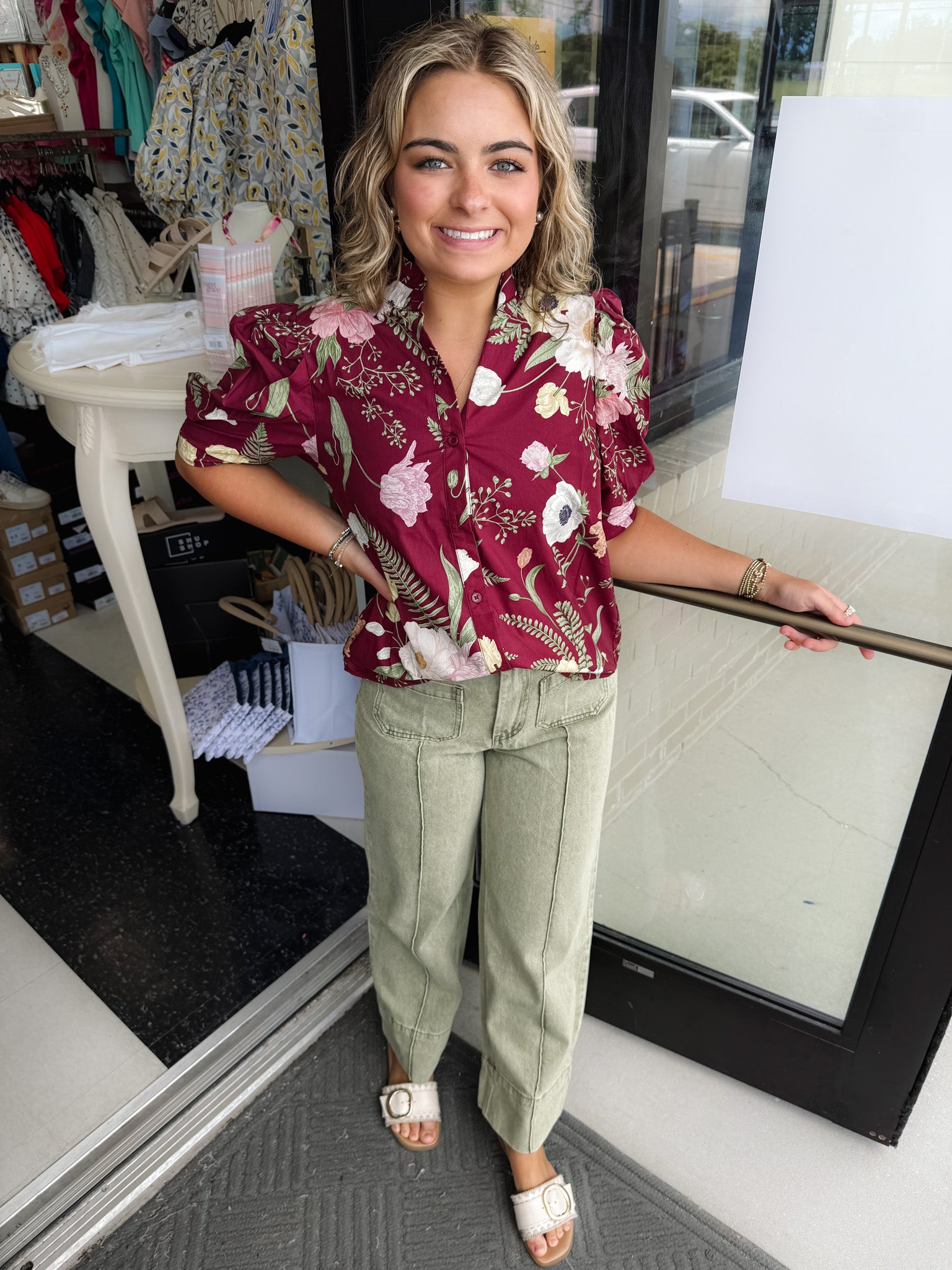 Introducing the Lola top, a showstopper in floral print with a ruffled neckline and button front closure. The short puff sleeves are elegantly accented with pleating detail, while the unlined design provides a touch of modesty without being sheer. Elevate your wardrobe with this luxurious and sophisticated piece.
