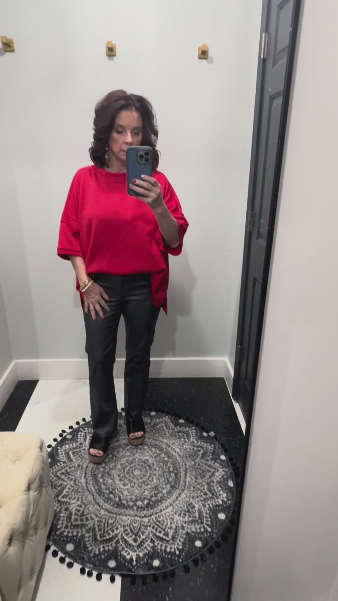 The oversized silhouette is thoughtfully detailed with a classic round neckline, side slits, and a modern hi-low hemline, creating graceful movement and contemporary shape. Its rich ruby hue adds warmth and sophistication, making it an effortless choice for transitioning from day to night.