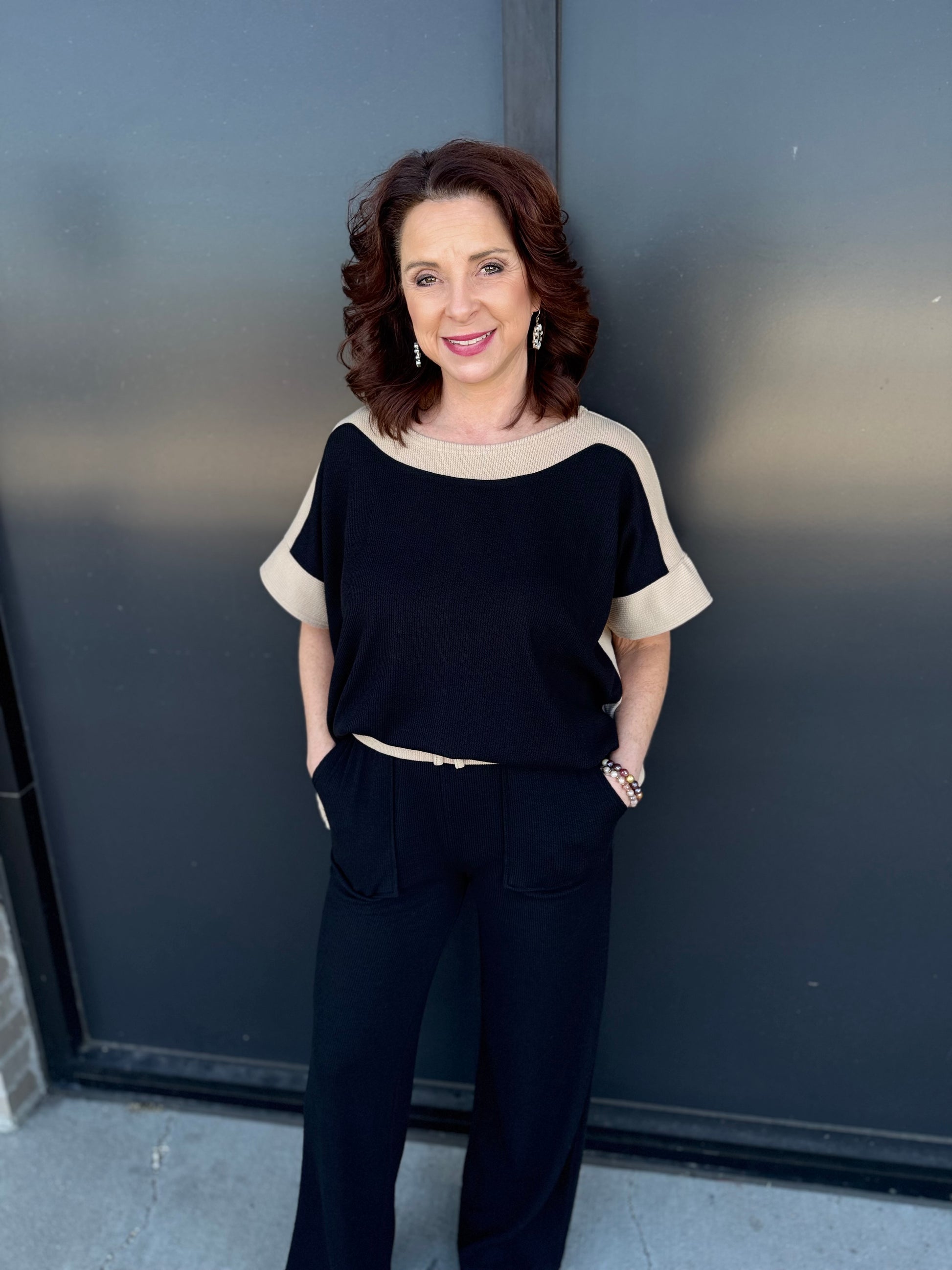 The Verona Color Block Set combines timeless elegance with contemporary ease. Featuring a refined black and tan palette, this coordinated t-shirt and pant set delivers a sleek, streamlined look that transitions seamlessly from day to night. Crafted from a luxurious blend of 95% polyester and 5% spandex, it offers the perfect balance of softness, stretch, and all-day comfort.