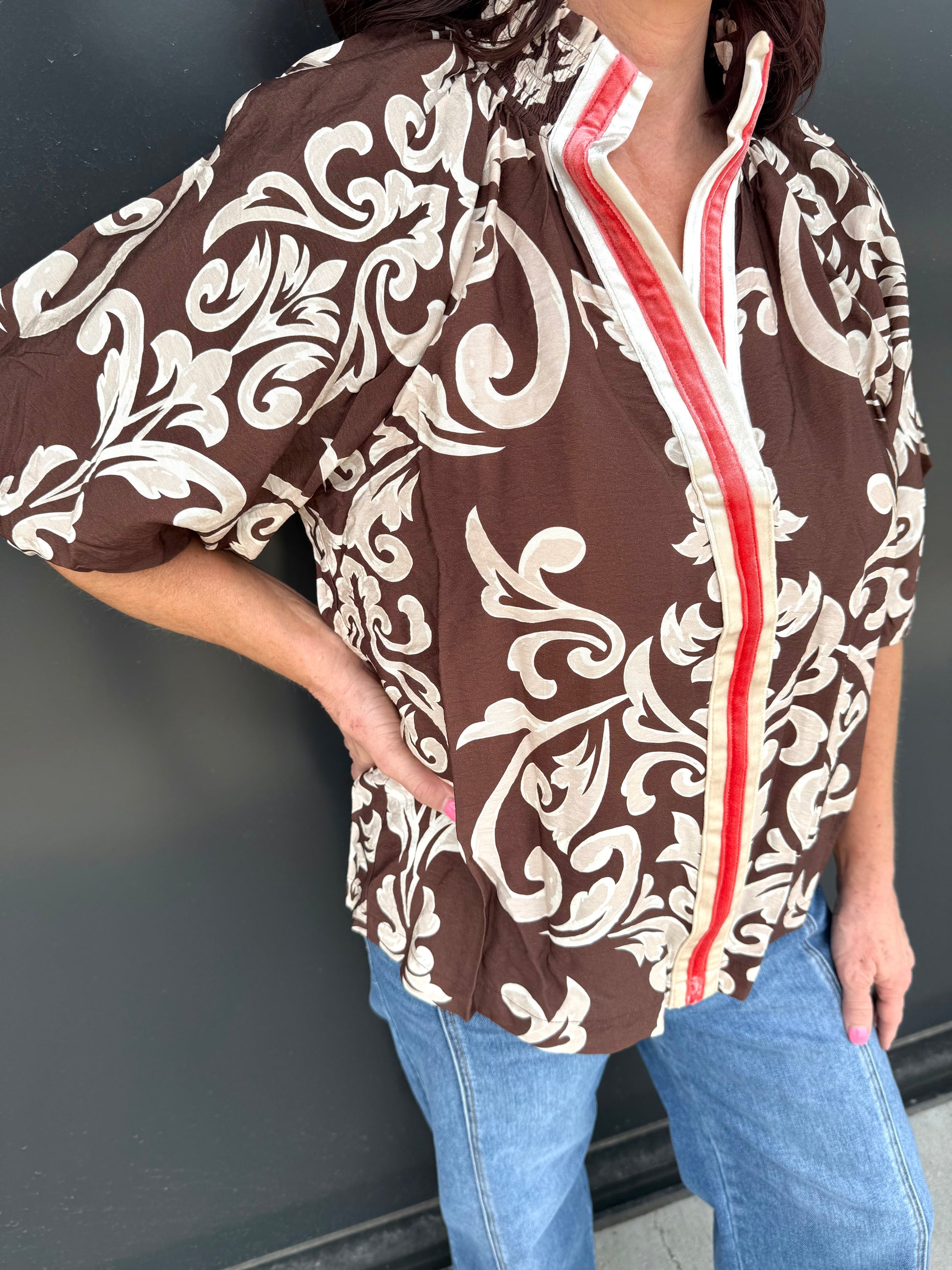 Elevate your wardrobe with the THML Charlie Top, featuring elegant brown puff sleeves and a delicate print detail. This sophisticated piece combines classic charm with modern style, perfect for refined everyday wear or special occasions. Its flattering silhouette and subtle design make it a versatile addition to any collection.