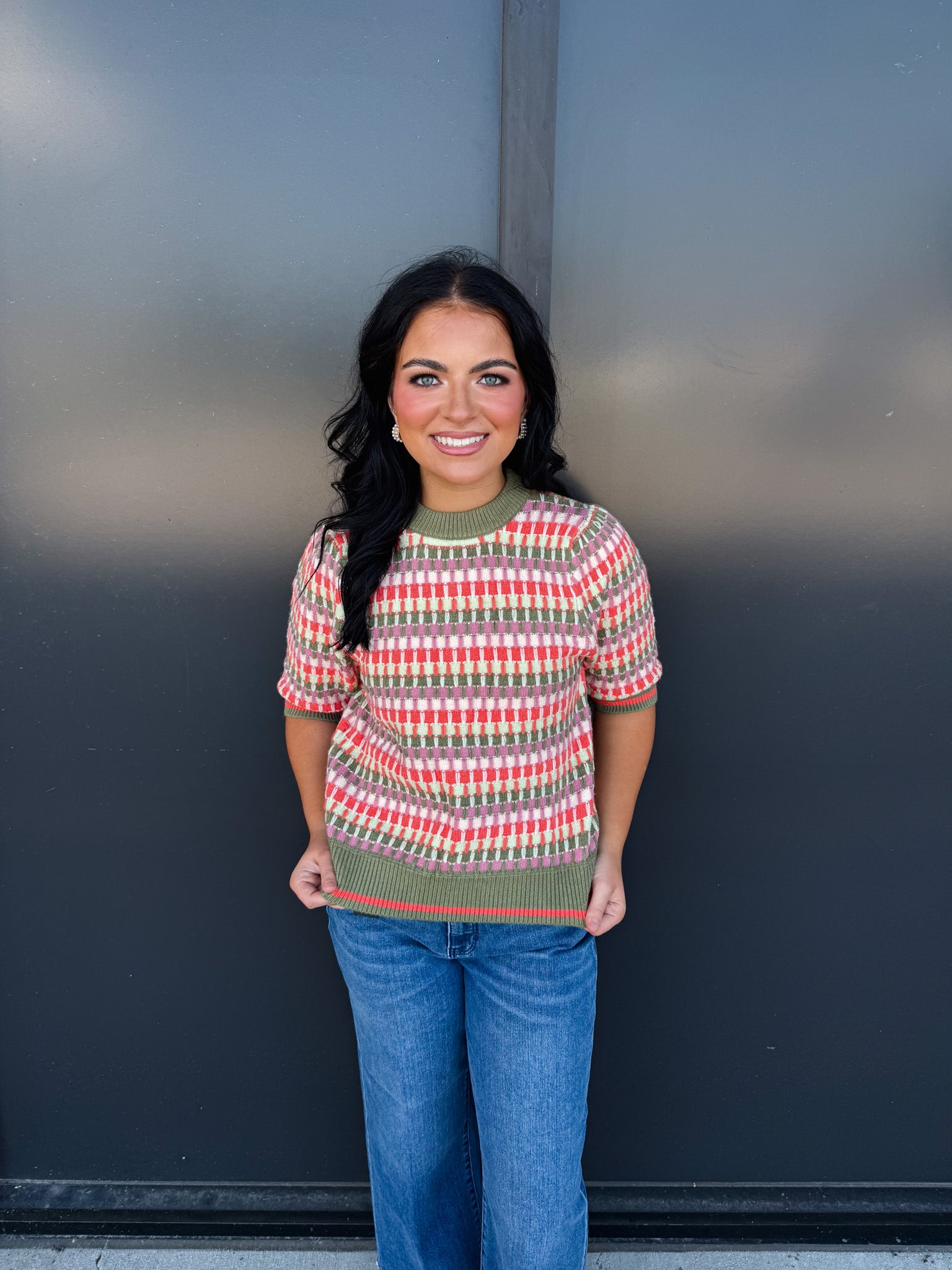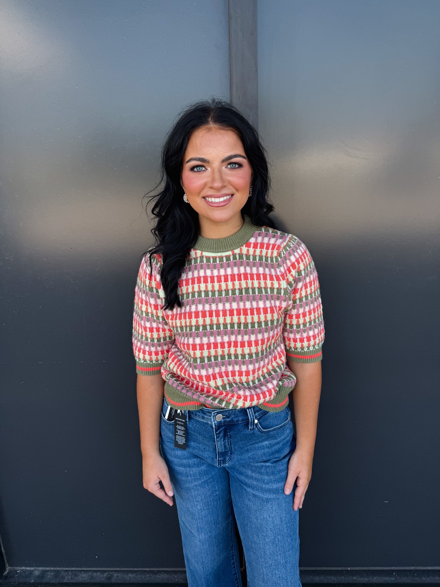 Elevate your wardrobe with the THML I'm Certain Top, featuring a refined multi-color knit design. This short sleeve piece offers a sophisticated blend of comfort and style, perfect for a polished yet effortless look. Its intricate knit fabric ensures breathability while adding subtle texture, making it an ideal choice for both casual and dressier occasions.
