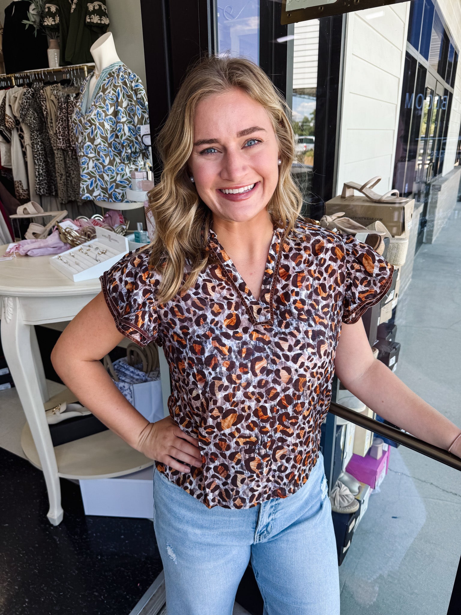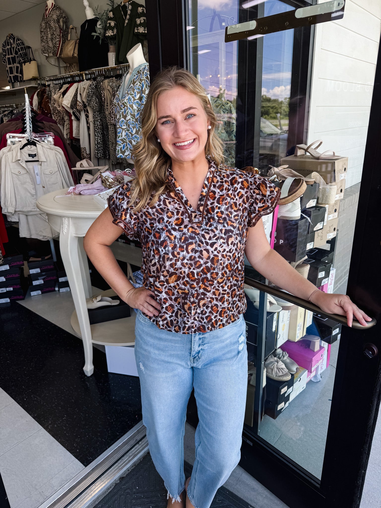 Elevate your wardrobe with the THML Wild Bloom Top, featuring elegant flutter sleeves and a bold leopard print that adds a touch of refined wildness. Designed for effortless sophistication, this top combines flattering movement with timeless style, perfect for both day and evening occasions.