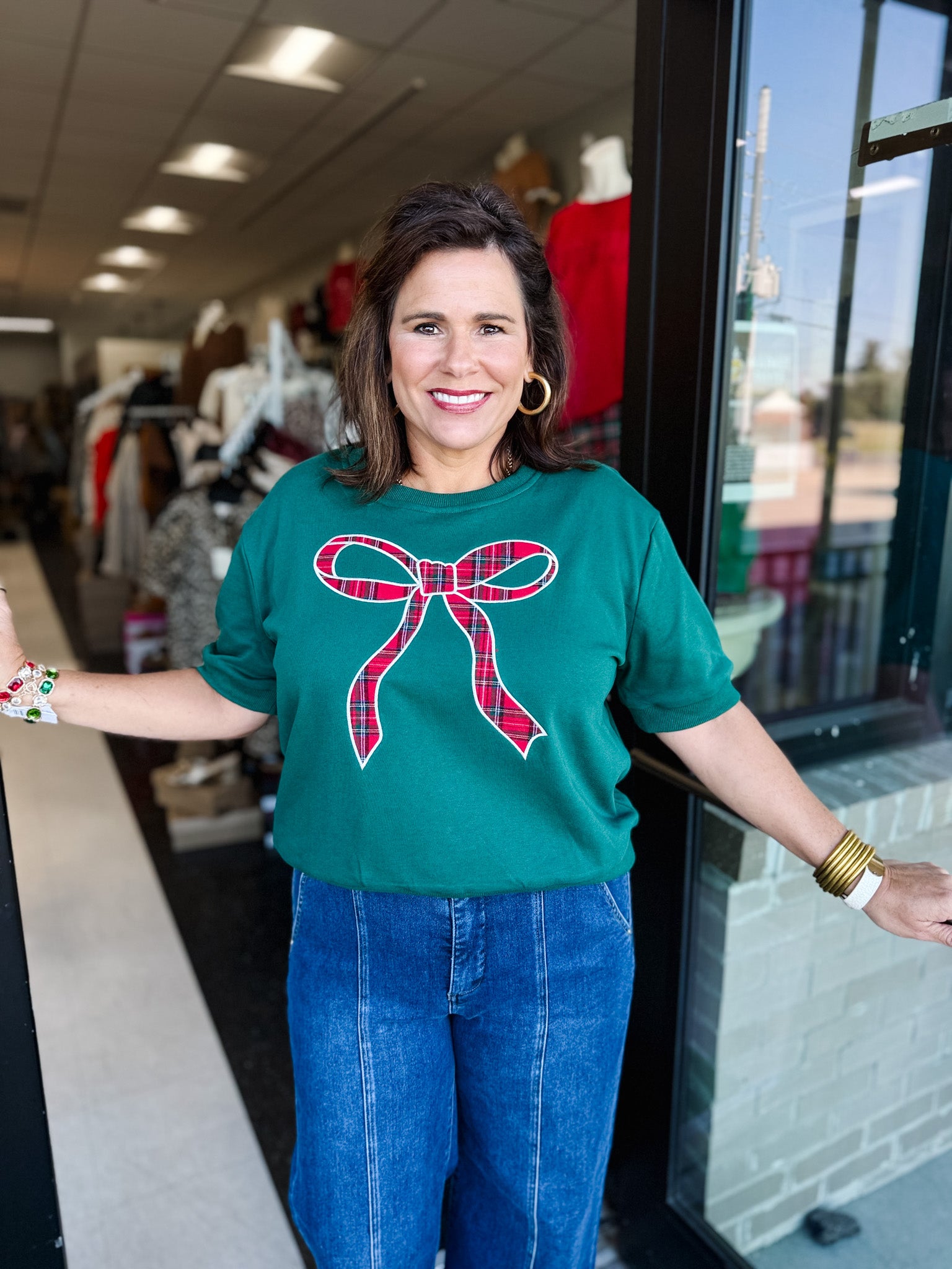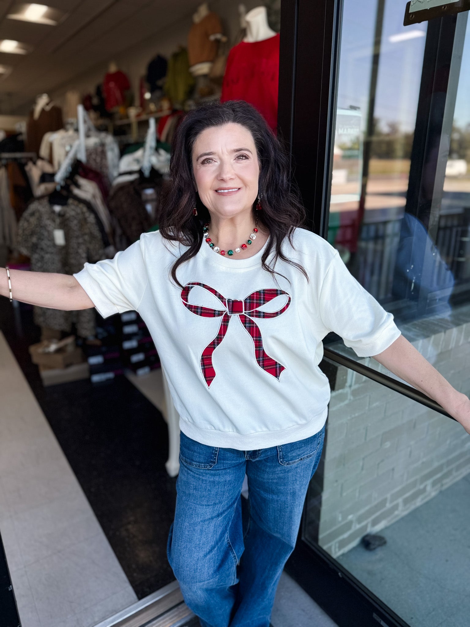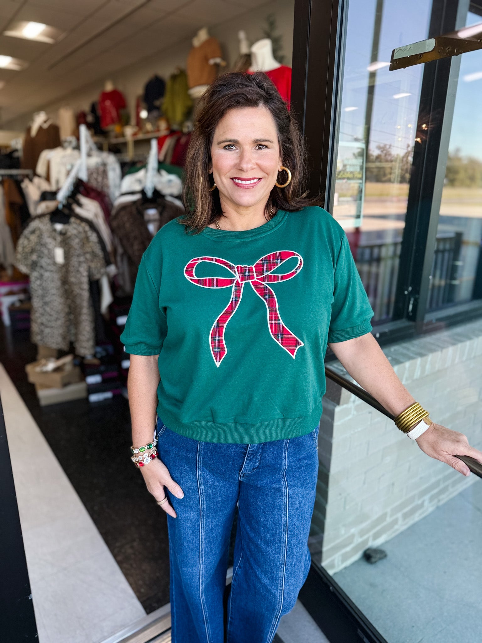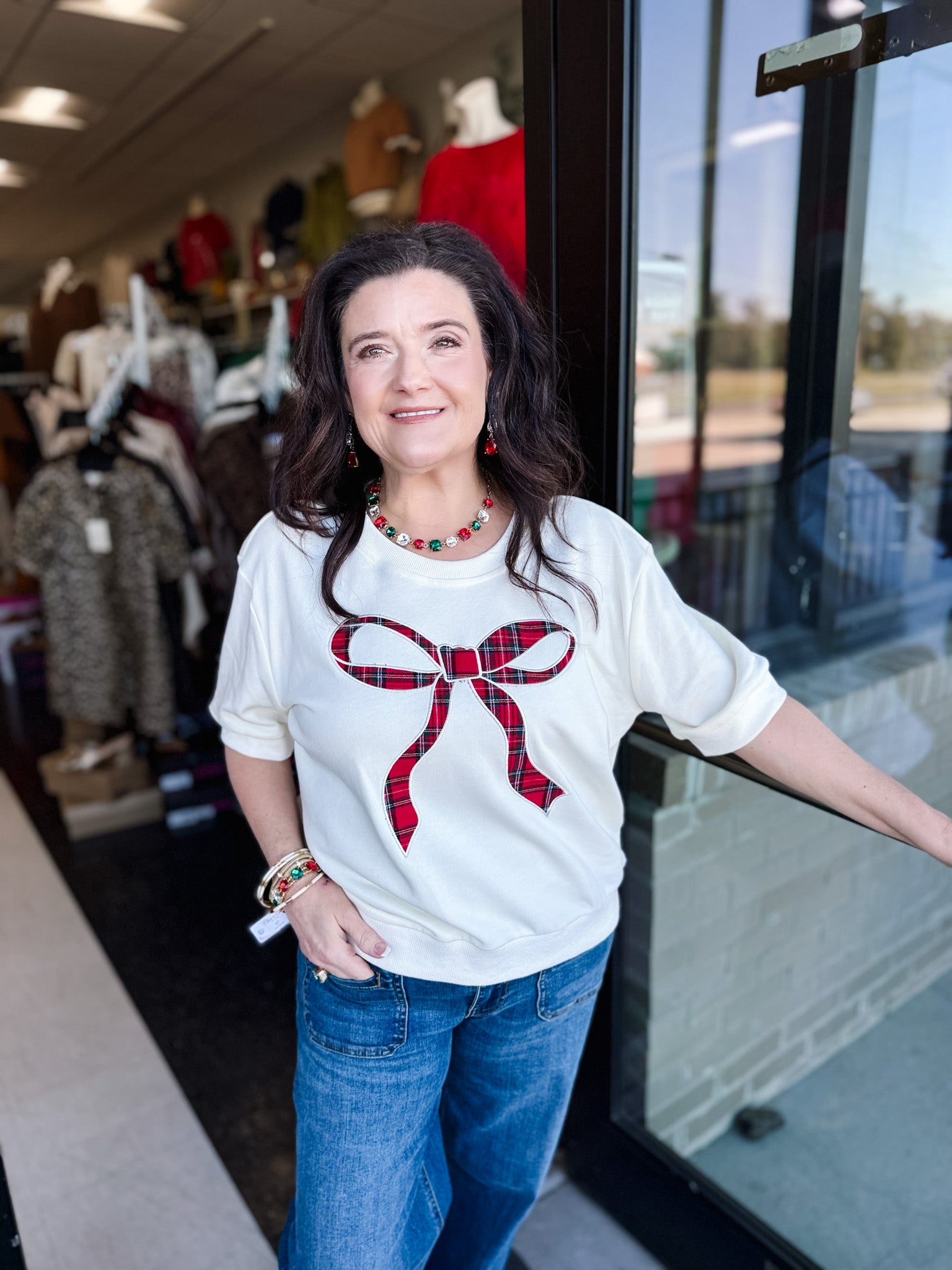 Elevate your seasonal wardrobe with the Tis The Season Sweater Top, featuring a refined plaid knit accented by a delicate bow. Its short sleeves and round neckline offer a polished silhouette, perfect for layering or wearing on its own. This sophisticated piece blends comfort with timeless style for effortless elegance.