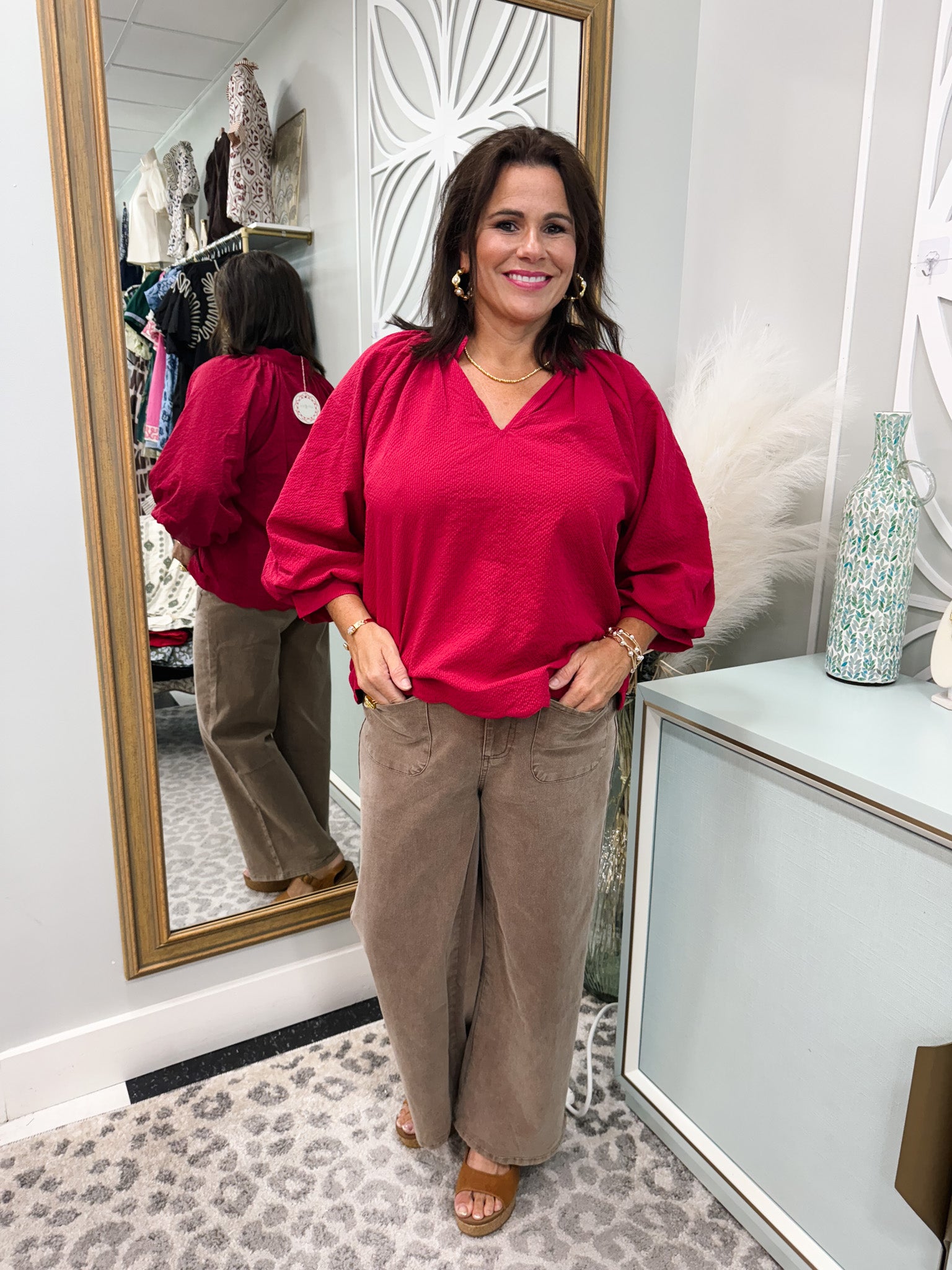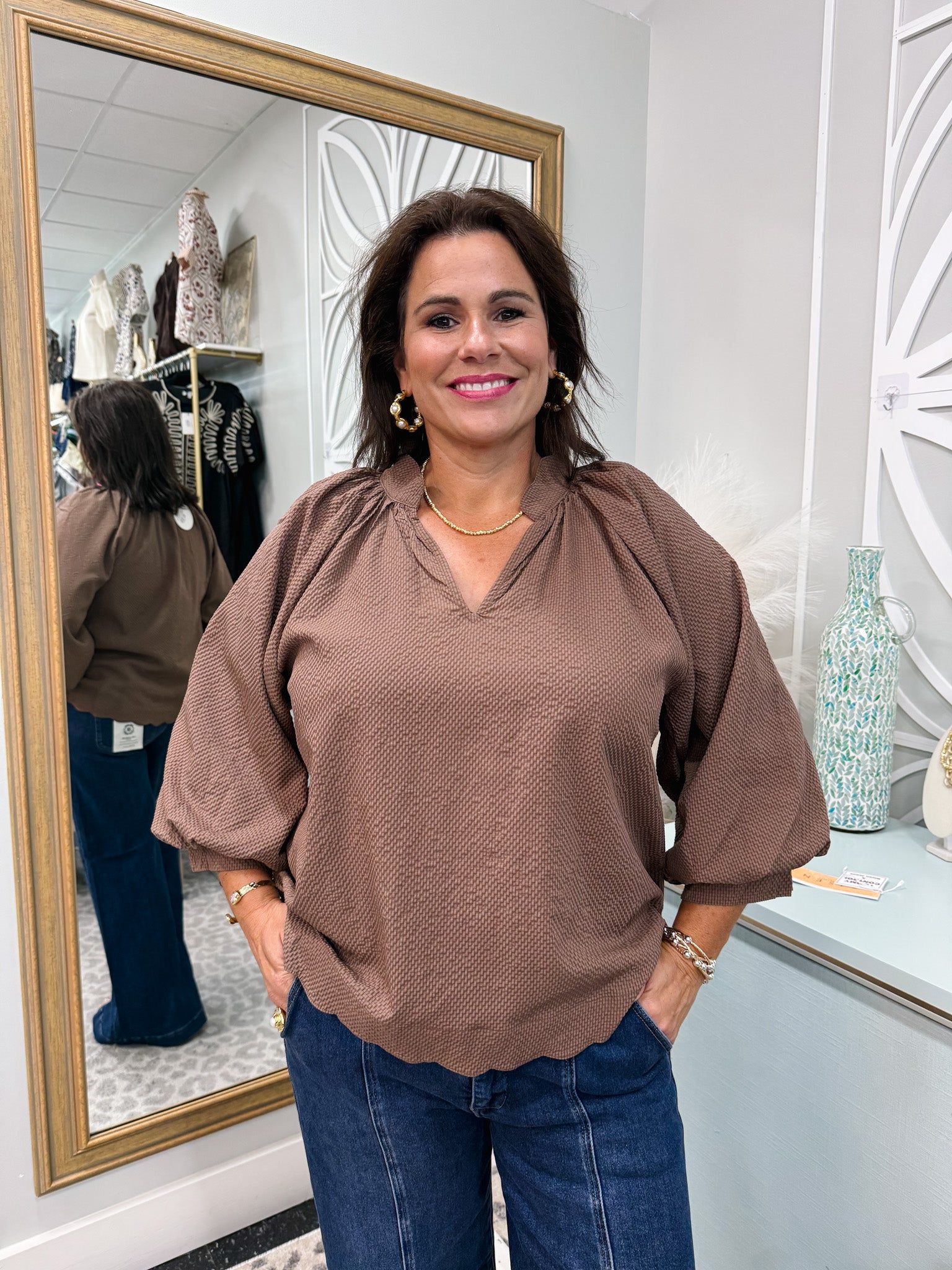 Elevate your wardrobe with the Umgee As You Are Top, featuring a textured fabric that adds subtle depth. Its elegant V-neckline and 3/4 balloon sleeves create a refined silhouette, while the relaxed, flowy fit ensures comfort throughout the day. The scalloped hemline adds a delicate finishing touch, making this unlined top perfect for sophisticated, effortless style.