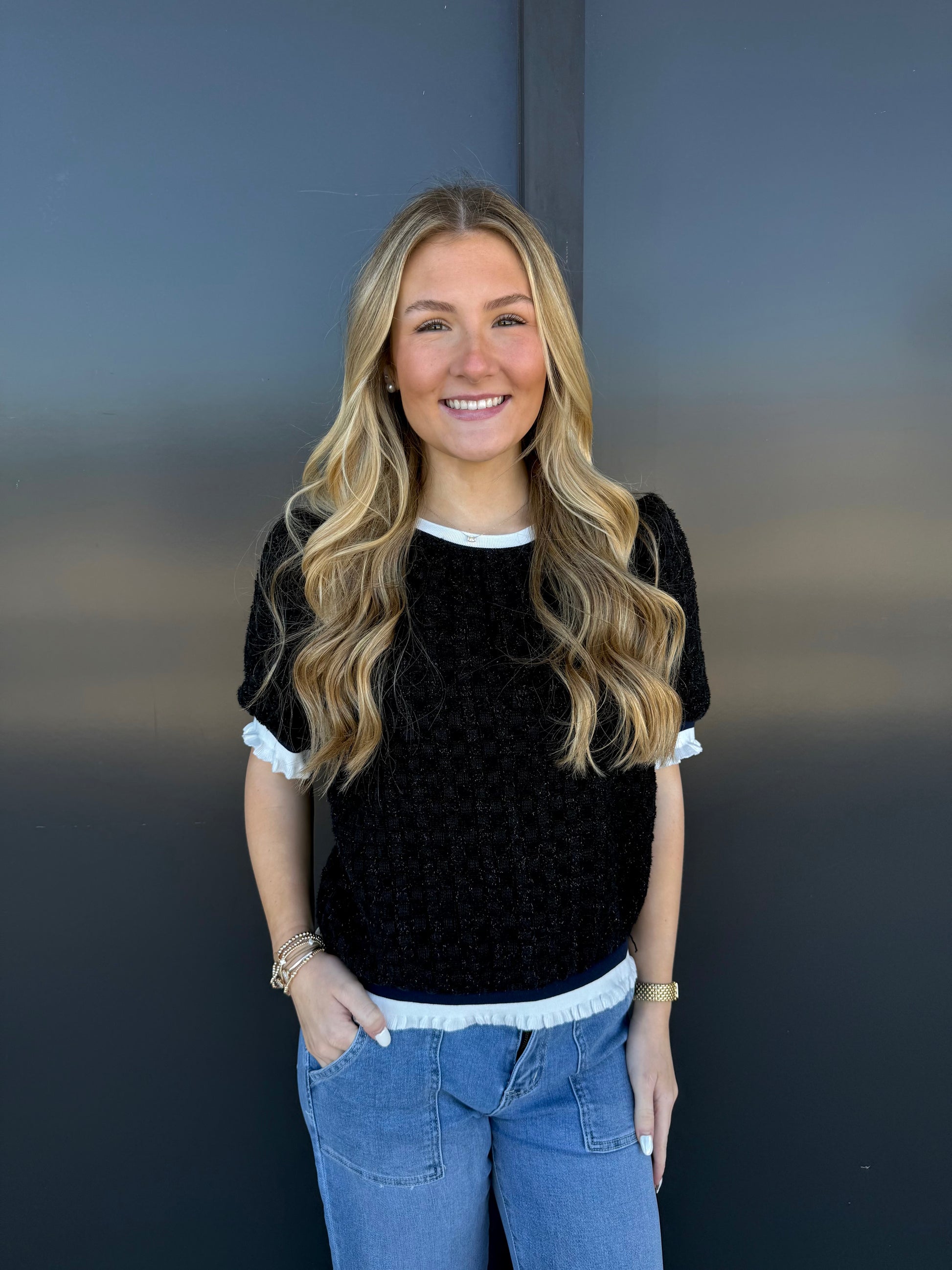 The Voy Paige Top exudes sophistication and grace with its tweed material and delicate puff sleeves. The subtle stripe pattern and ruffle band add a touch of elegance, making it the perfect top for any occasion. Dress it up or down, this taupe top is a must-have for any fashion-forward individual.