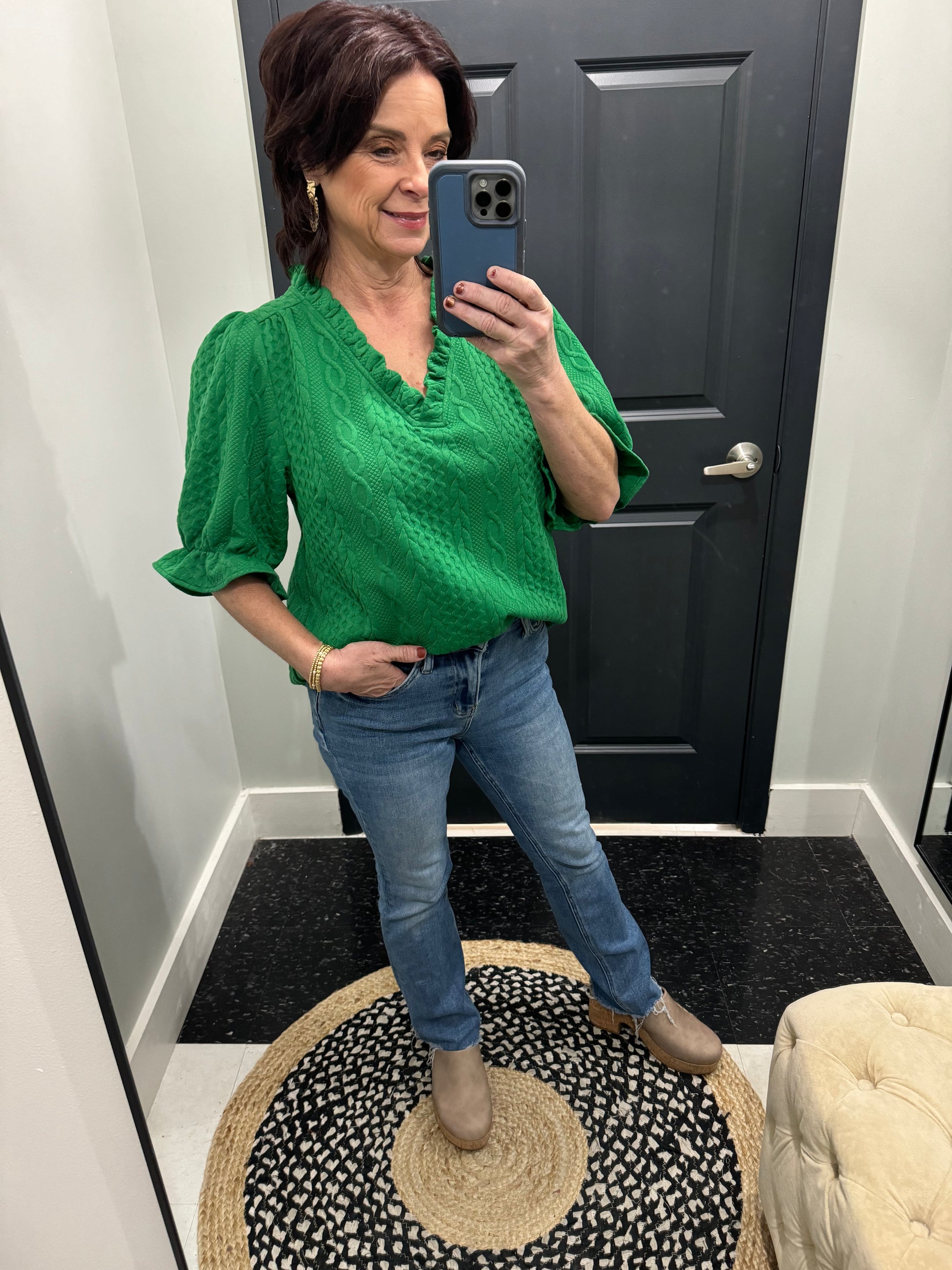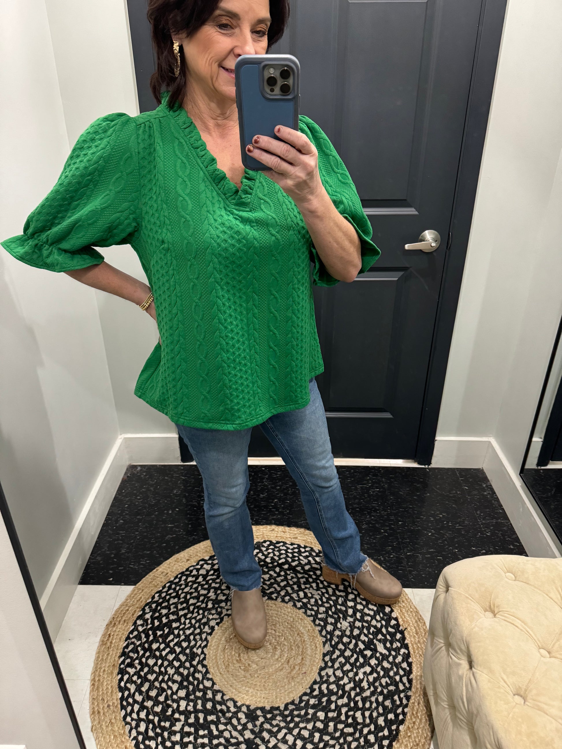 Get ready for your next adventure with the Voy Roma Top! This playful top features a deep V ruffle neck and a unique textured knit, perfect for adding a touch of fun to any outfit. Stay stylish and comfortable with this quirky top.