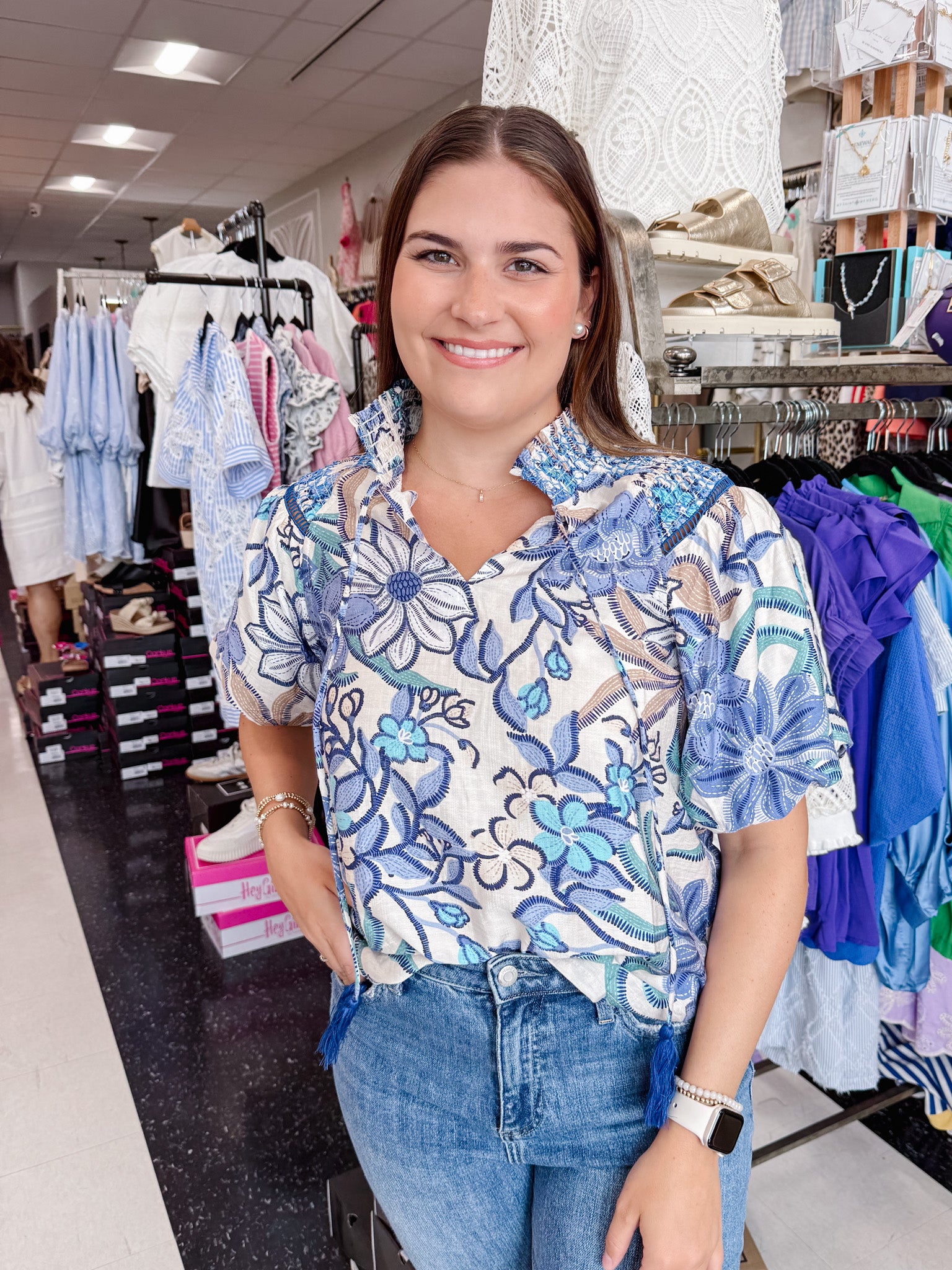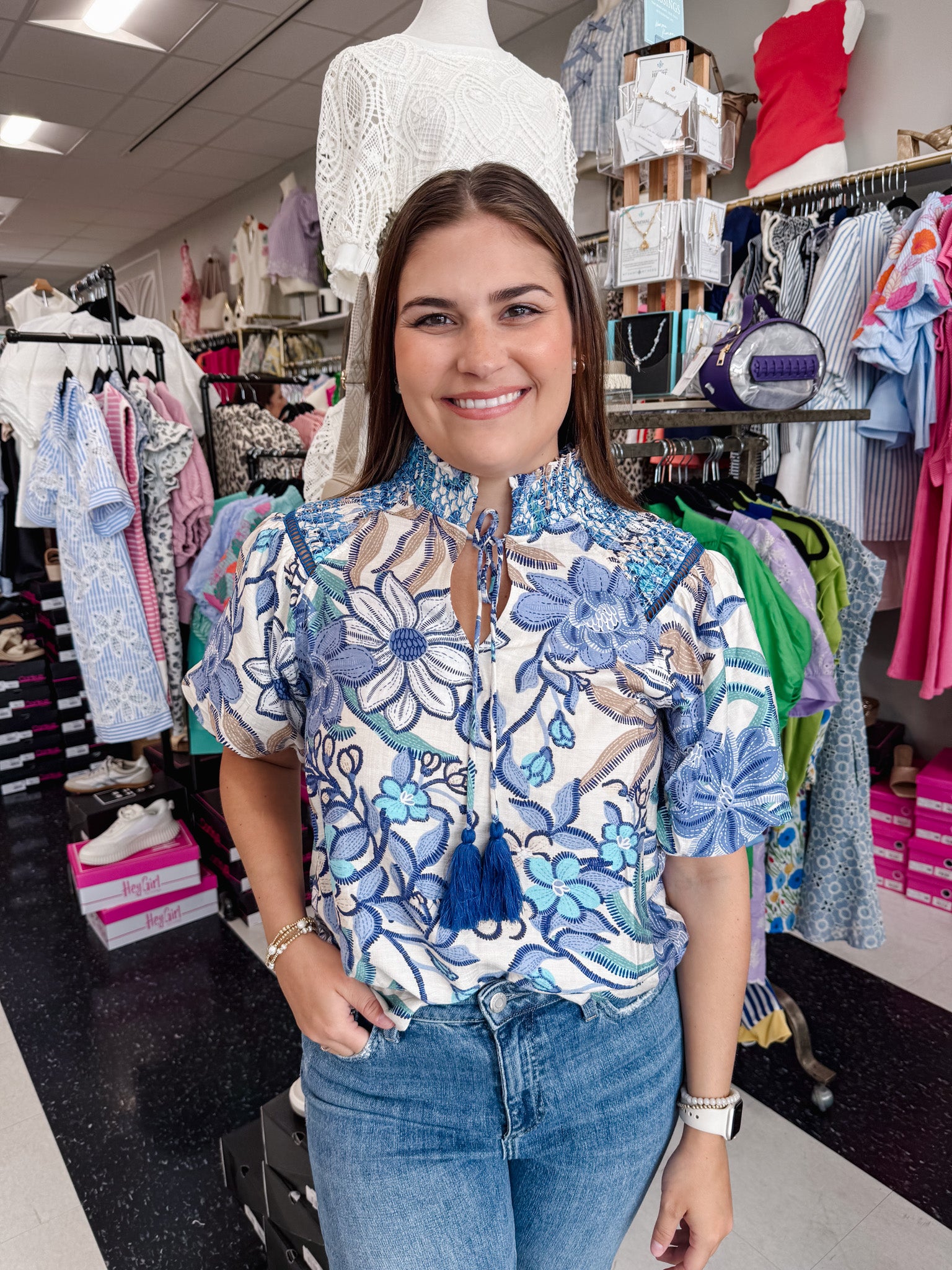 Introducing the Voy Samantha top - a stunning piece with a gorgeous floral print and a sophisticated V-neck design. The short bubble sleeves add a touch of whimsy, while the smocking neckline detail creates a luxe feel. Exude elegance and exclusivity in this must-have top. Features front tassel details.