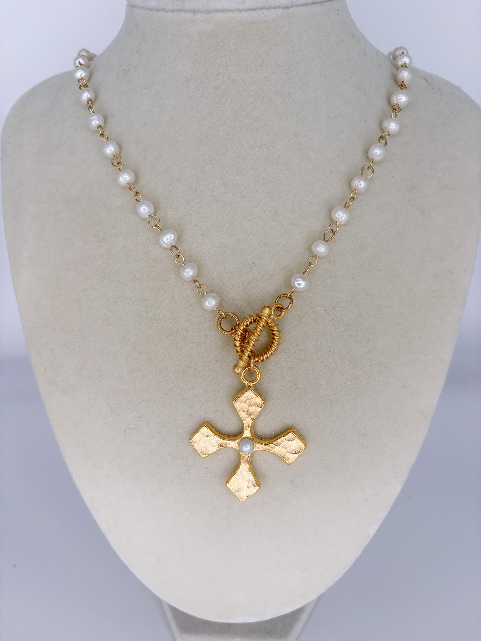 Enhance your style with the WD Hammered Cross with Pearl Accents. Designed by Weisinger, this cross pendant is 18k gold plated and rests on a 32" pearl chain. The hammered texture adds a unique touch, making it a perfect accessory for any outfit. Elevate your look with this elegant and sophisticated piece.
