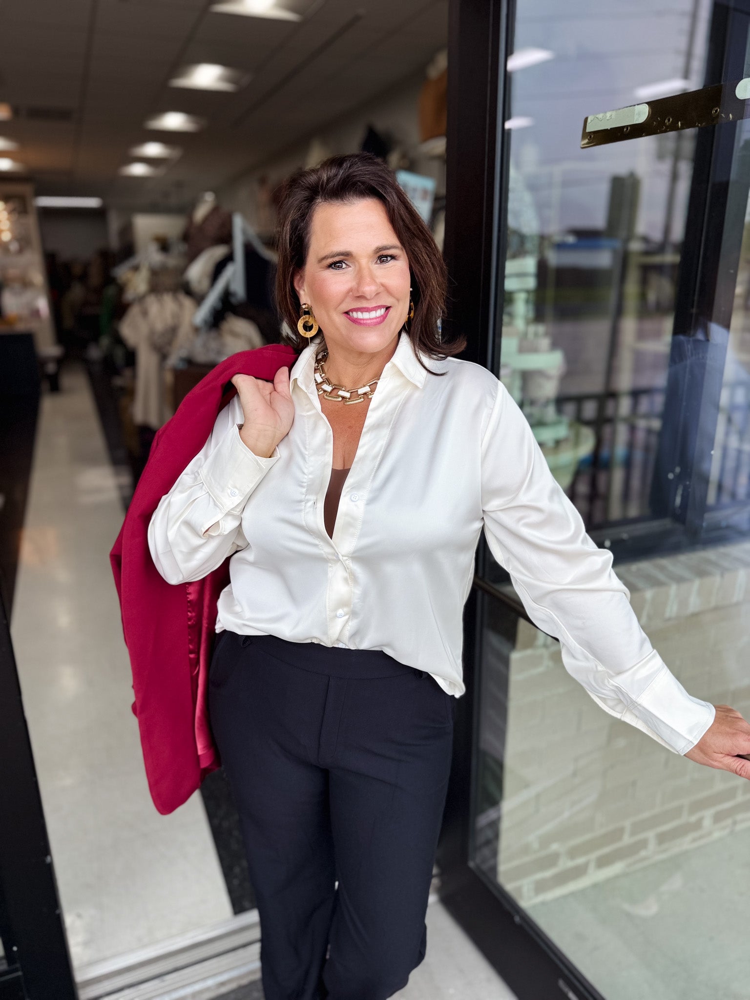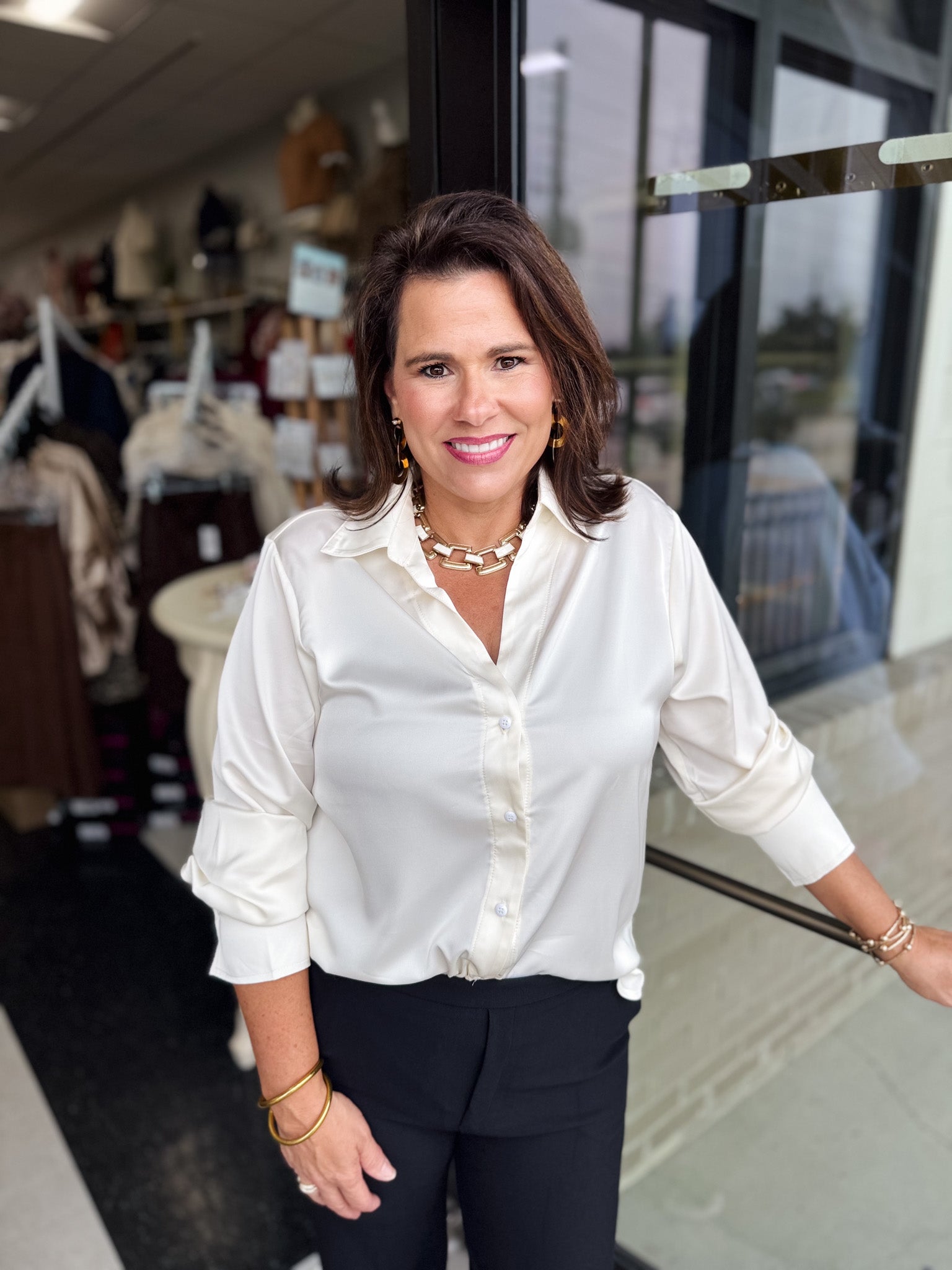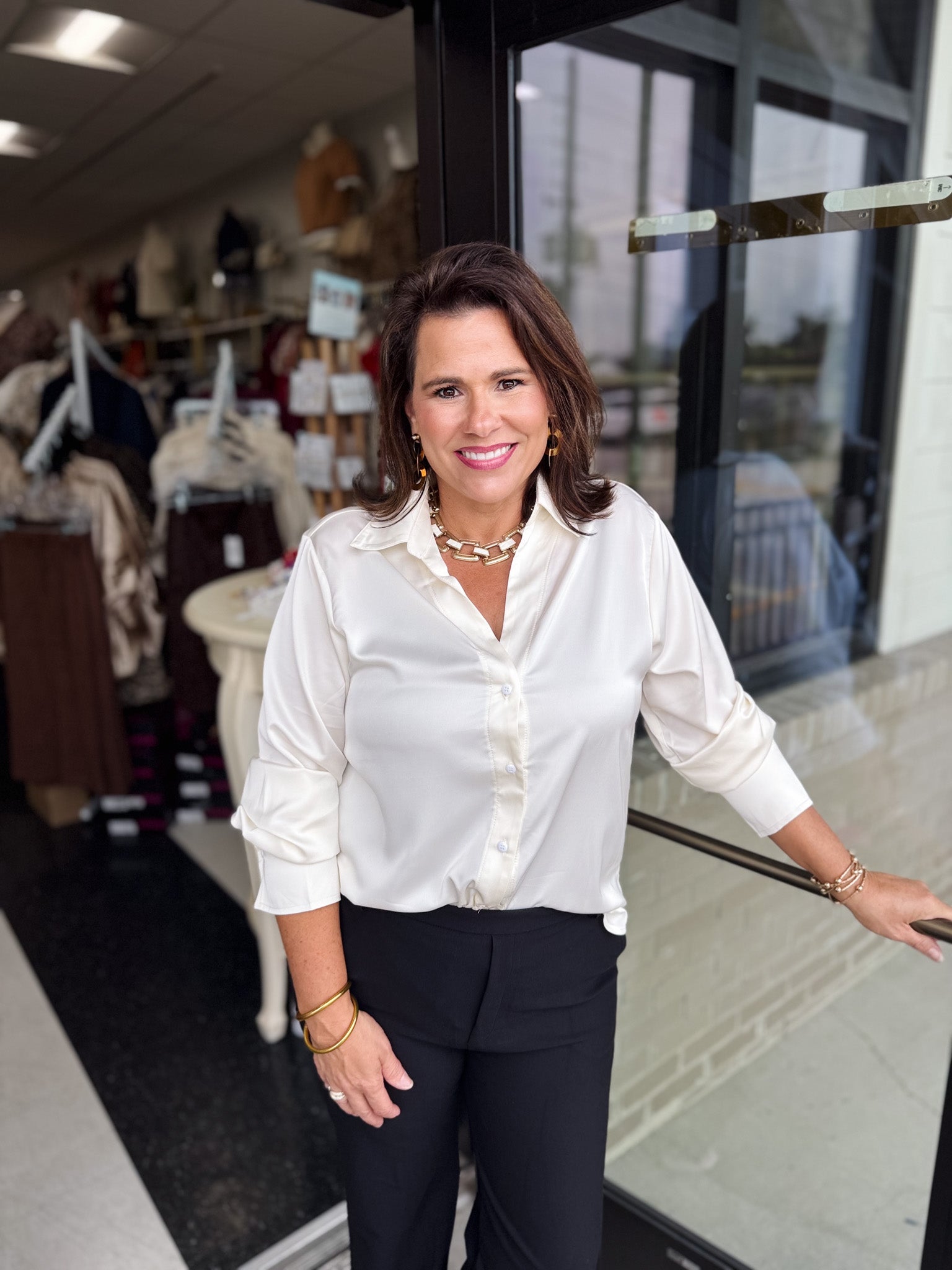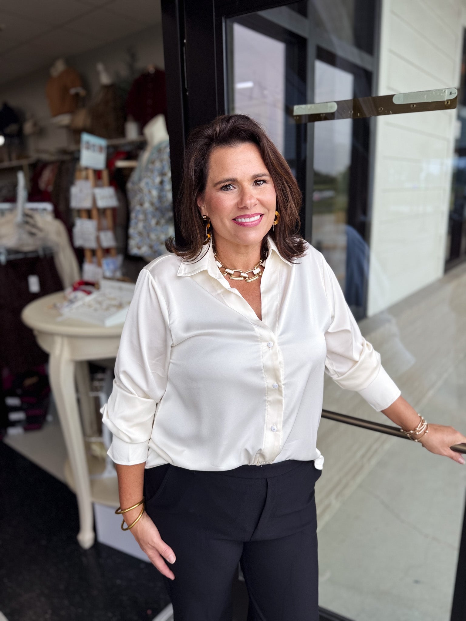 Experience elegance with the Whip Cream Button Up Top. Crafted from smooth satin, this luxurious shirt features a classic button-front silhouette, a refined point collar, and long sleeves finished with button cuffs. Its flattering fit effortlessly enhances your wardrobe with timeless sophistication.