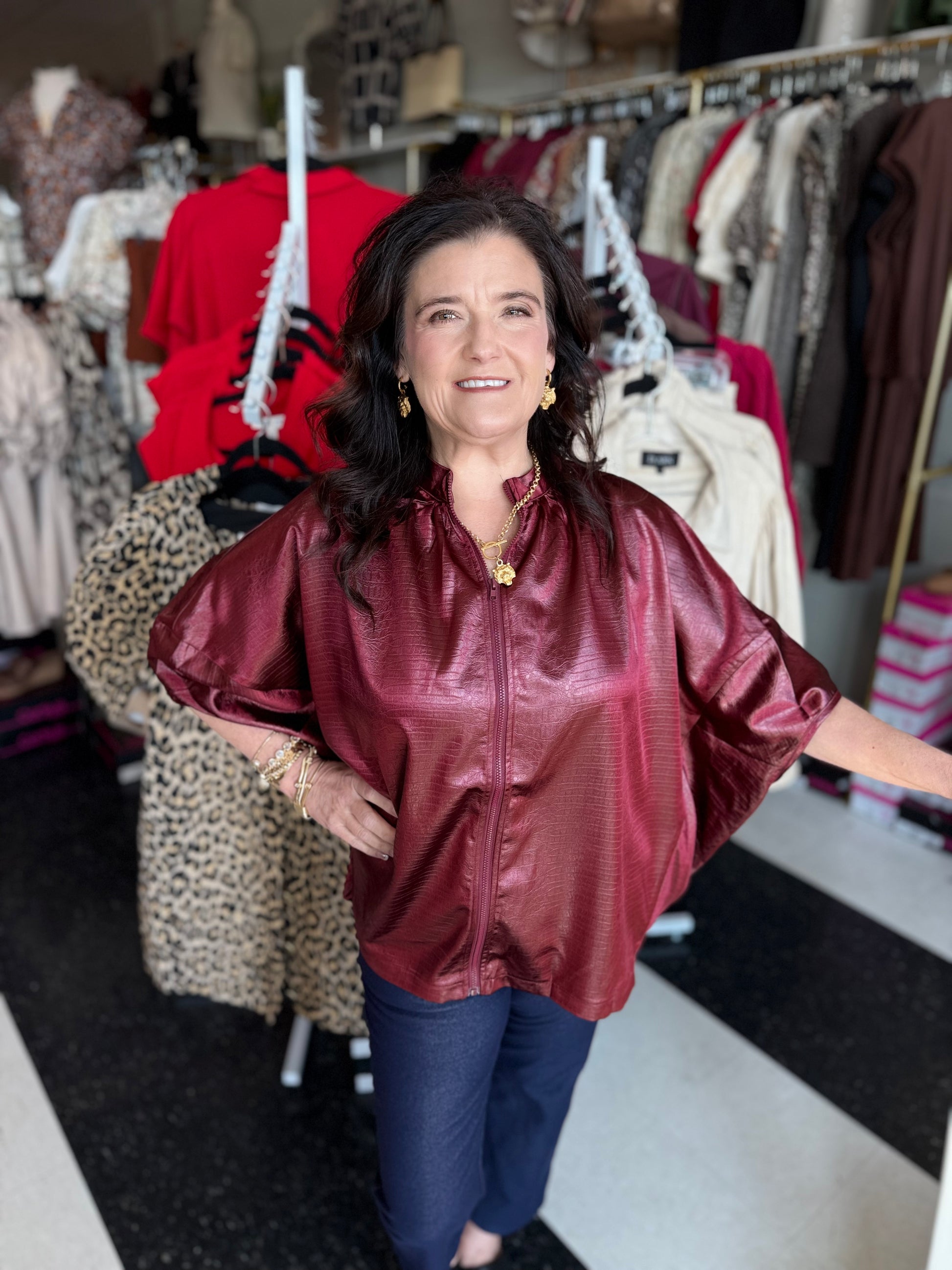 - Evening Glam: Unzip slightly and pair with statement jewelry, slim-fit pants, and heels for a sleek, night-out ensemble.